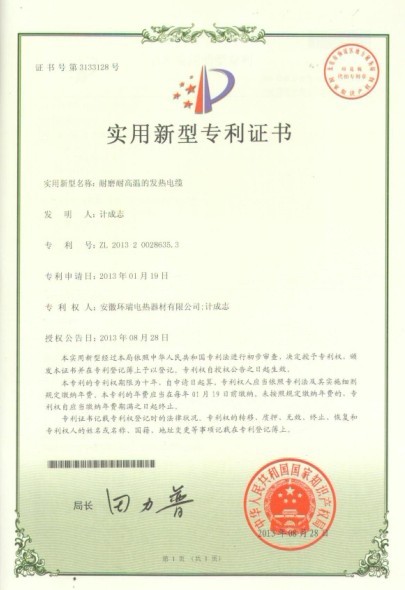 環(huán)瑞自成立研發(fā)小組至科學(xué)技術(shù)中心期間,通過(guò)獨(dú)立開發(fā),引進(jìn)國(guó)外先進(jìn)的生產(chǎn)工藝與技術(shù),與合肥工業(yè)大學(xué)建立長(zhǎng)期合作關(guān)系,聘請(qǐng)相關(guān)專業(yè)的技術(shù)專家等模式,投入大量的人力物力。我司以安全,實(shí)用性能為目標(biāo),通過(guò)改變發(fā)熱電纜結(jié)構(gòu)與原材料,已研發(fā)成功。目前已獲得了關(guān)于畜牧養(yǎng)殖專用的國(guó)家專利證書,研發(fā)出耐高溫,耐磨的雙層絕緣的發(fā)熱電纜獲得了2項(xiàng)國(guó)家專利證書。包括之間我司獲得的“混凝土養(yǎng)護(hù)發(fā)熱電纜”“天溝融雪專用發(fā)熱電纜”,截止,我司已獲得了5項(xiàng)關(guān)于發(fā)熱電纜的國(guó)家專利證書,我司發(fā)熱電纜的生產(chǎn)技術(shù)已達(dá)到國(guó)內(nèi)先進(jìn)。共計(jì)19項(xiàng)專利。新的專利證書已下達(dá)。