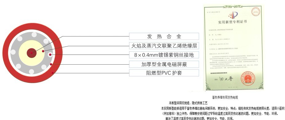 我司提供的一種畜牧養殖幼崽專用發熱電纜,包括有發熱合金,所述的發熱合金外依次包覆有塑料導體、氟隆絕緣層、火焰及蒸汽交聯聚乙烯絕緣層、鍍錫紫銅絲接地、加厚型金屬電磁屏蔽層、阻燃型PVC外護套和彈性橡膠軟套,所述的發熱合金和塑料導體融為一體,防止電打火的情況發生。