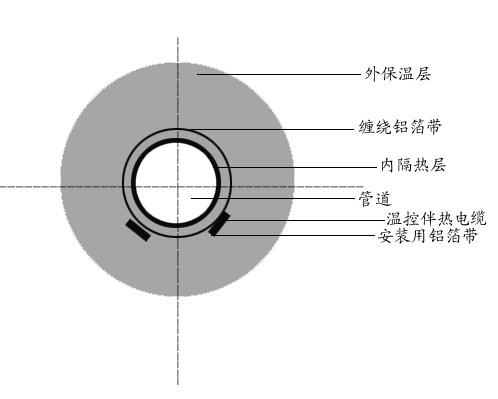 由于蒸汽掃線時(shí)間相對(duì)較短。一般控制在30分鐘左右。可采用下圖雙層保溫結(jié)構(gòu)來(lái)保證使用。一般來(lái)說(shuō),這種結(jié)構(gòu)的內(nèi)層保溫厚度為5-10mm.在內(nèi)保溫層外加包鋁膠帶,鋁膠帶上敷設(shè)自控溫電熱帶。每毫米內(nèi)層保溫層可使掃線溫度減低10℃左右,或采用隔離支架,每米1—2只,效果也較理想。當(dāng)然,在掃線時(shí)必須停止通電,管線熱損失仍按常規(guī)設(shè)計(jì),保溫層厚度只能按外層為計(jì)算厚度。