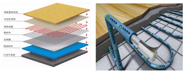 發熱電纜地面輻射供暖系統,是將加熱用的發熱電纜暗埋于地面混凝土填充層內,通電加熱后系統溫度控制在不超過65℃范圍內安全工作。系統運行過程中,熱量經裝飾后的混凝土填充層傳導,小部分熱量以對流方式加熱室內空氣,同時,大部分熱量以輻射方式向室內的物體、人體和建筑結構傳導加熱,物體通過吸收輻射熱量后,其表面的溫度升高,從而達到加熱并保持室溫得目的。其中,系統運行過程中以輻射方式的加熱量約占總加熱量的60%以上。
