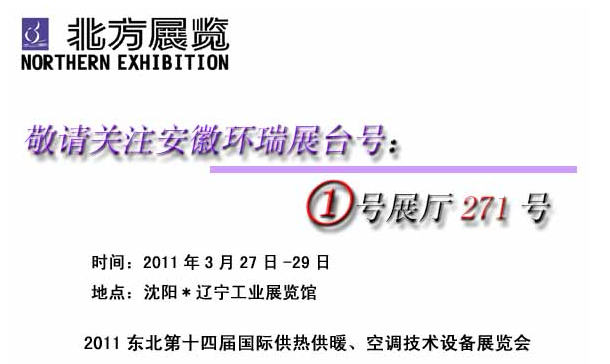 2011年3月27日-29日,安徽環(huán)瑞參加?xùn)|北國(guó)際供熱空調(diào)設(shè)備展覽會(huì)。屆時(shí),我們公司將展出公司的新型技術(shù)產(chǎn)品。希望廣大新老客戶(hù)來(lái)我展臺(tái)參觀洽詢(xún),我們的展會(huì)人員將以飽滿的情緒接待來(lái)至世界各地的每一位關(guān)注我們安徽環(huán)瑞的貴客。