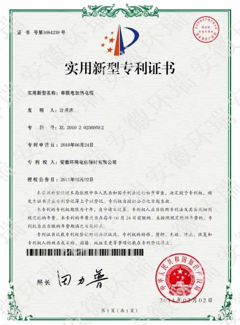 安徽環(huán)瑞串聯(lián)恒功率電伴熱帶國家電熱帶專利產(chǎn)品介紹